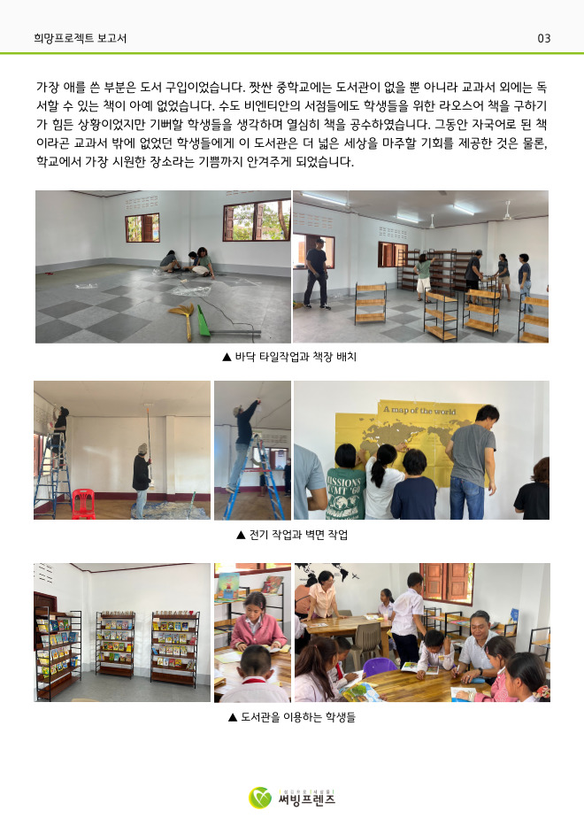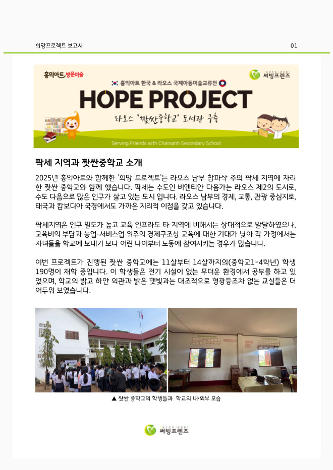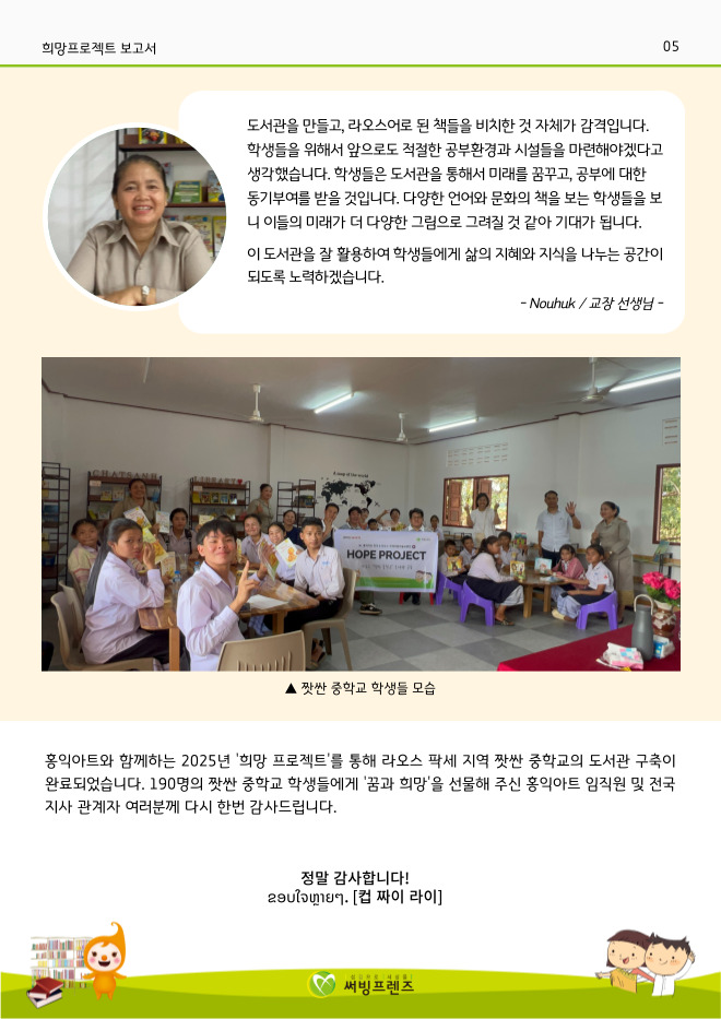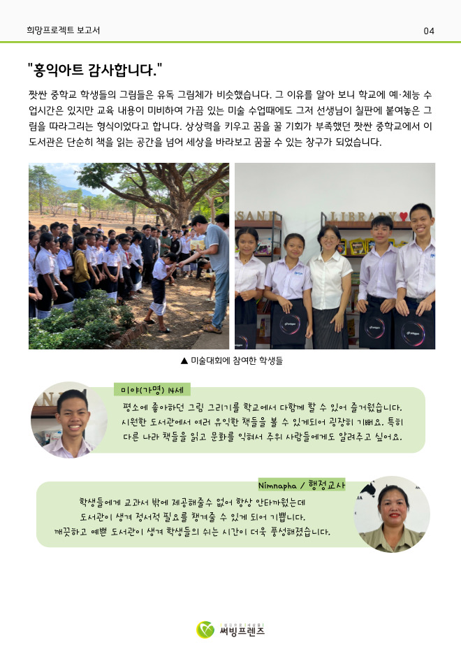 2025년 홍익아트 국제아동 미술교류전 '희망 프로젝트'로 라오스 짯싼 중학교에도 도서관을 선물할 수 있게 되었습니다.